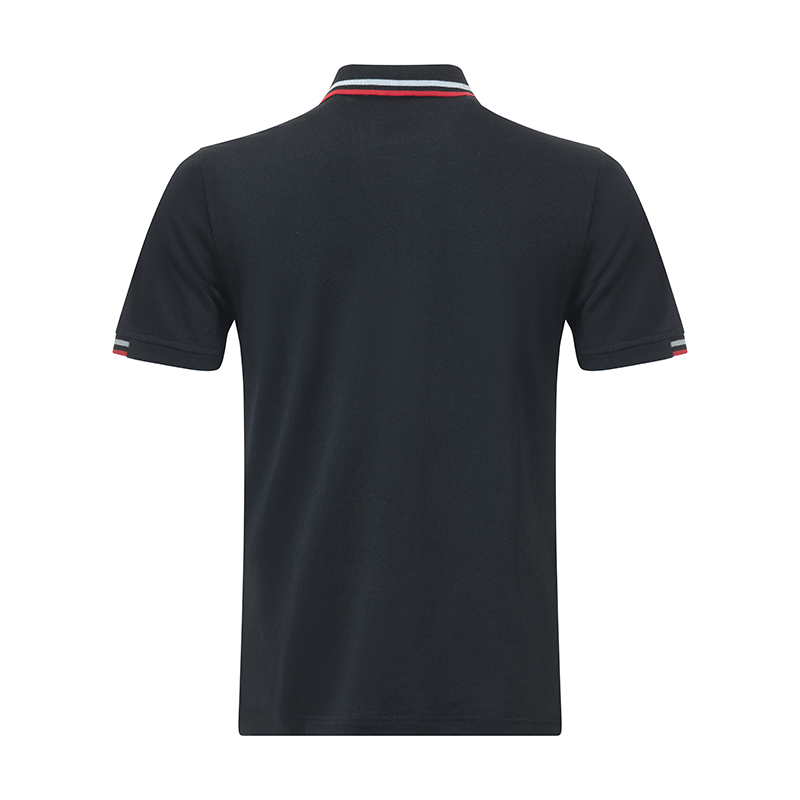 180 gsm 60/40 Polycotton lacoste fabric Short Sleeve Knitted collar golf shirt Knitted cuffs Front hino logo emroidered and finished with a bold red stripe and
