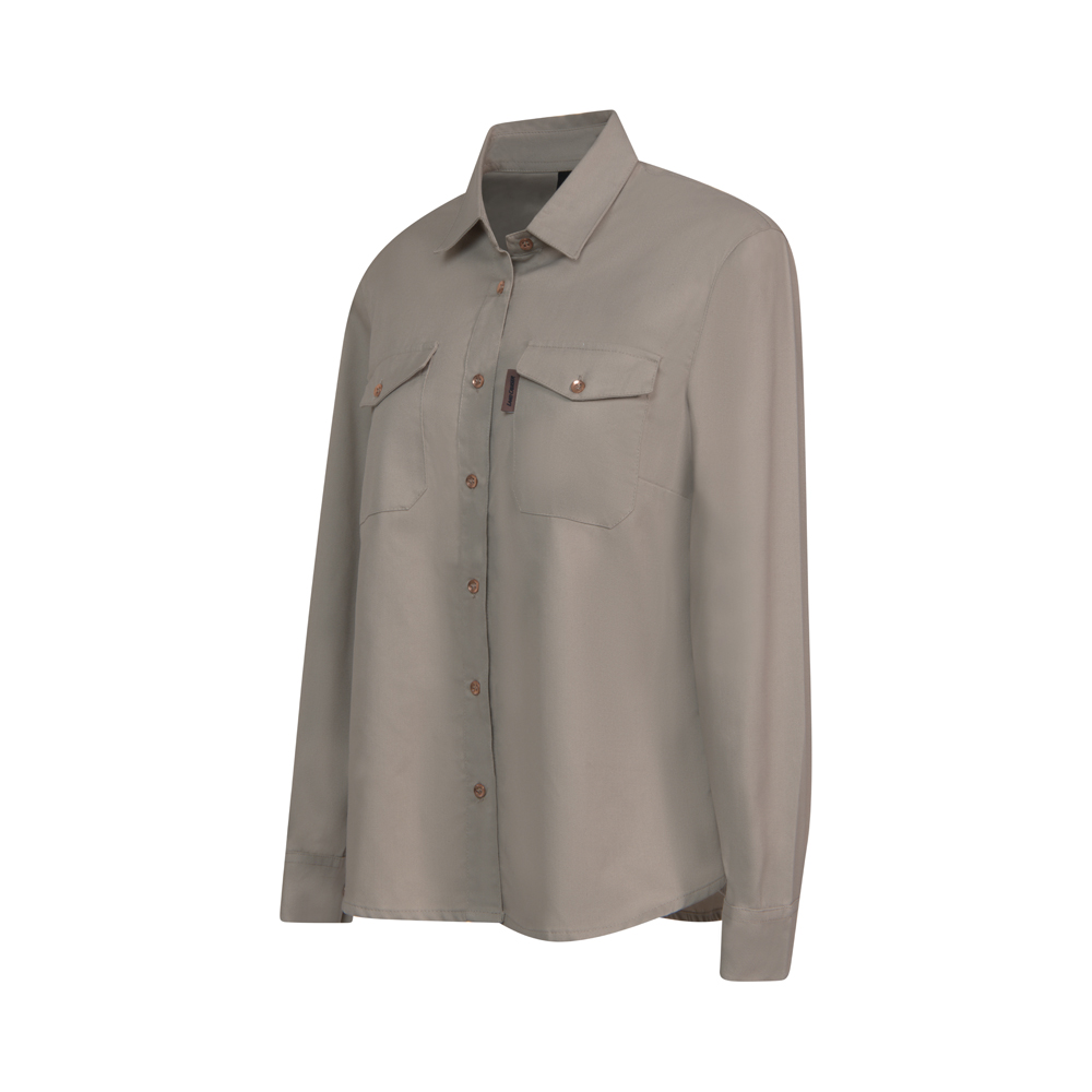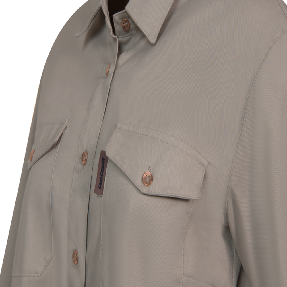 This stylish khaki bushwear shirt is made from durable polycotton, perfect for outdoor activities in any season. Whether you’re exploring nature trails or enjoying a countryside getaway, the rose gold buttons and printed Land Cruiser sidewinder offer a blend of practicality and fashion for year-round versatility.