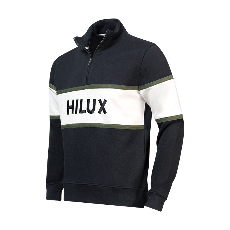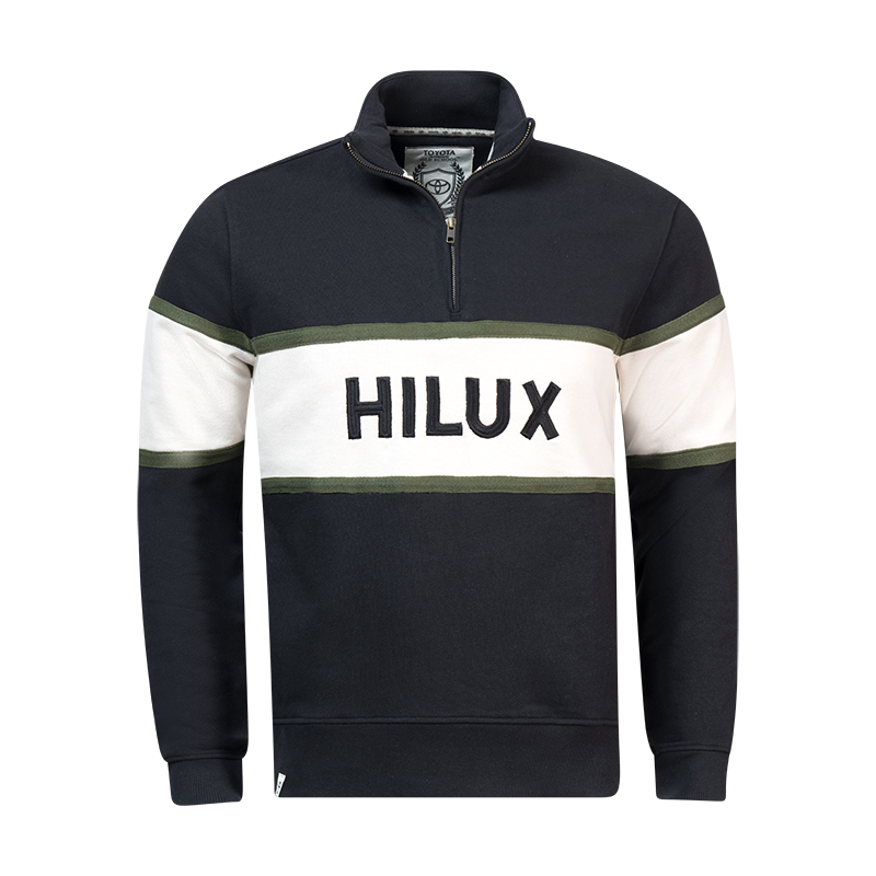 Rugged meets refined in this premium Hilux Quarter Zip Sweat designed for those who move with purpose. Cut from heavyweight 100% cotton in bold black, it features a striking cut-and-sew ivory chest panel framed with military olive twill tape for a utilitarian edge. The HILUX name is satin stitch embroidered front and centre, delivering bold brand pride with a tactile finish. A YKK quarter zip adds premium functionality to this statement piece.